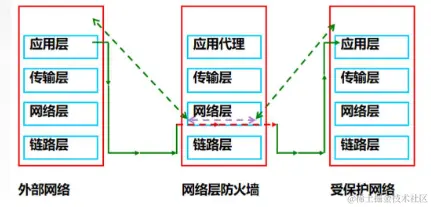 1.单层防火墙模式——只在网络的一个入口处设置防火墙,所有的数据流量都需要经过这个防火墙,并接受其管理和过滤。这种模式的优点是部署简单,易于管理,但是在防护能力方面相对较弱,容易被攻击者绕过。