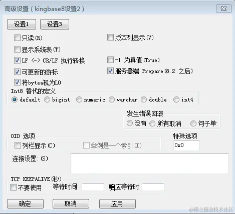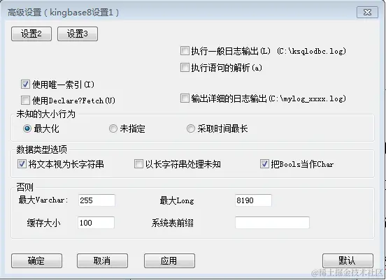Linux系统中设置字符串的方式主要有两种:一种是在数据源配置文件“odbc.ini”文件中设置;另一种是在使用SQLDriverConnect接口调用连接串时增加相应的属性与值。若在“odbc.ini”配置文件中设置属性后,便不需在调用SQLDriverConnect接口时再次构造连接串。而在Windows系统中,有KingbaseES ODBC数据源配置工具,从而不用手动在odbc.ini”文件中进行属性的添加,选择其中“高级设置-数据源”便可进行扩展属性设置,如下所示: