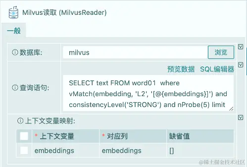 3. Milvus读取:根据输入的向量,从Milvus向量库中查询匹配的数据。这里使用SQL语句方式访问。由于Milvus本身不支持SQL的访问方式,所以这里使用的是基于开源项目MOQL对Milvus支持的语法格式。在SQL语句中我们使用了@{embeddings}变量,该变量表示上下文变量,上下文变量可以与算子的输入列做绑定映射。该算子有一个名为embeddings的输入列,所以从配置中可以看到,变量embeddings与embeddings列做了映射绑定。运行时,变量会被输入列的值替换掉,从而生成可运行的SQL语句。当输入为多条记录时,每条记录都会驱动一次SQL的生成与检索。