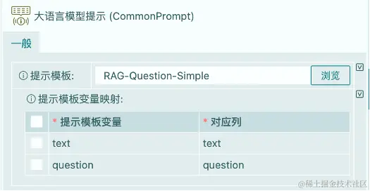 模板内容为:“请根据以下内容回答问题:\n @{text} \n问题: @{question} “。需要为模板中的变量设定列映射。运行时,HuggingFists用列值替换模板中的变量,从而生成最终输入到大语言模型的提示。