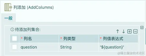 5. 列添加:列添加在这里是一个技巧型的应用。主要是因为流程后面的“大语言模型提示”算子使用的提示模板中需要将内容和问题一起组合成为一个提示。而在上一步通过过滤获得的输出信息中只有数据信息,没有问题信息。所以,在这里为数据添加一个问题列。问题列的值使用${question}变量描述,该值与算子1中的变量值一致,会一同被替换。