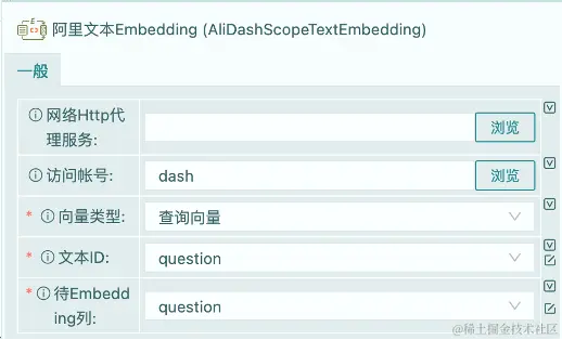 2. 阿里文本Embedding:选取向量类型为“查询向量”,将输入的问题按查询向量进行向量化。需要特别注意的是,这里的向量类型必须为“查询向量”,在进行文本向量入库时选择的类型为“底库向量”。