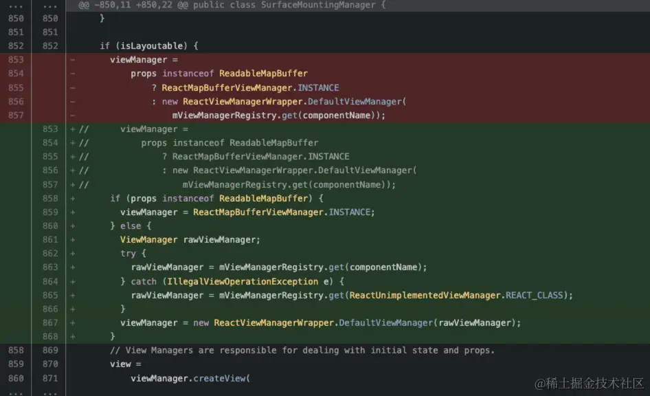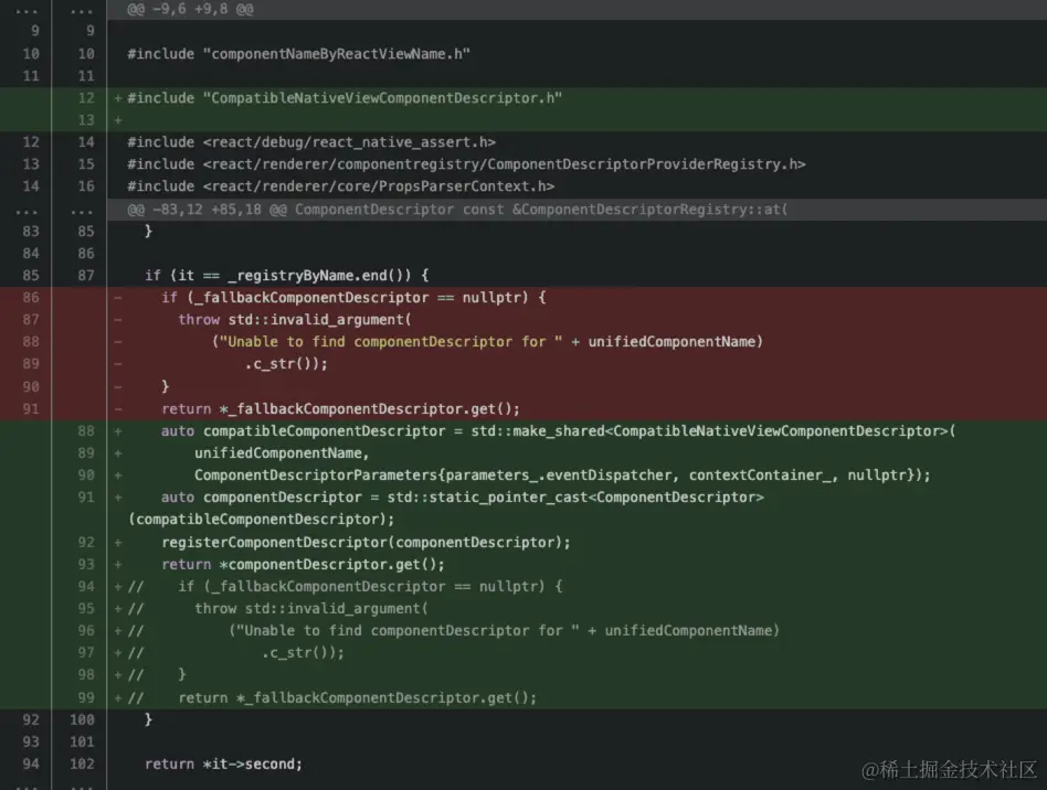 新架构中客户端一项重要的工作就是 NativeModule 和 FabricComponent 的改造,这块在新架构适配部分也有介绍,对于 NativeModule 我们选择了对部分高频使用的 Module 进行改造,比如我们的自定义协议传输的 Module,几乎所有业务的 JS 和 客户端通信都需要通过这里,这个 Module 改造完已经解决了大部分问题,对于 FabricComponent 我们通过分析源码发现虽然新架构源码中 FabricUIManager 必须使用 FabricComponent,但是仍然可以通过修改源码进行兼容,通过 Codegen 生成的 C++ 代码当前版本的主要作用是实现 Props 的类型定义,真正执行时还是会通过 TS 中的 RawProps 来操作需要变更的属性。所以最终我们通过更改 ComponentDescriptorRegistry.cpp 和 SurfaceMountingManager.java 的查找逻辑实现了兼容,重点代码如下: