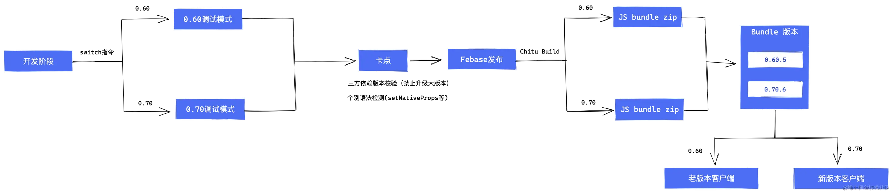 在打包发布平台上兼容模式是可配置的,RN 70 全量后,对于一些如营收相关的页面线上存量的 RN 0.60 版本客户端也非常重要,集成在 RN 0.60 版本客户端上的页面需要持续的维护,直到 RN 0.70 版本覆盖率到达到一定程度,到时才可以放弃少量的存量版本,这种情况可以一直保持 RN 0.60 版本和 RN 0.70 版本的配置,对于大部分应用在RN 0.70 全量后 RN 0.60 的兼容包就不需要再维护,则去掉打 RN 0.60 兼容包的配置即可。