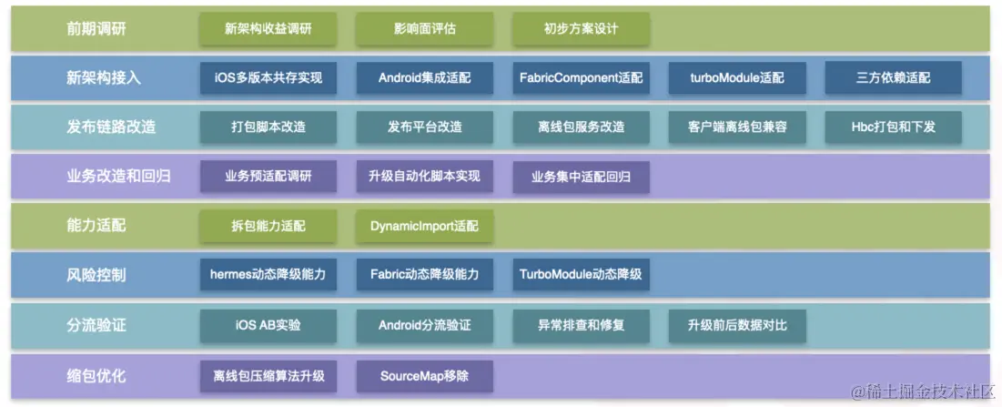 在 RN 0.70 版本中,新架构和引擎都存在非常大的不确定性,根据我们之前的 RN 使用经验,老版本中Android JavaScriptCore 引擎在开发测试期间都比较稳定,但是上线后会有一些出现概率不低的引擎侧异常,iOS 切换为 Hermes 后很可能有相同问题,所以要提前设计好上线的方式和节奏,尤其是在 iOS 系统上,由于苹果应用市场的限制,几乎不可能做到和 Android 一样的灰度和逐个应用市场放量的能力,所以为了避免风险,我们设计了 RN 0.60 和 RN 0.70 版本双动态库方案,即保证了稳定性,又为 AB 数据实验做好了准备,详细实现可以关注后续文章。