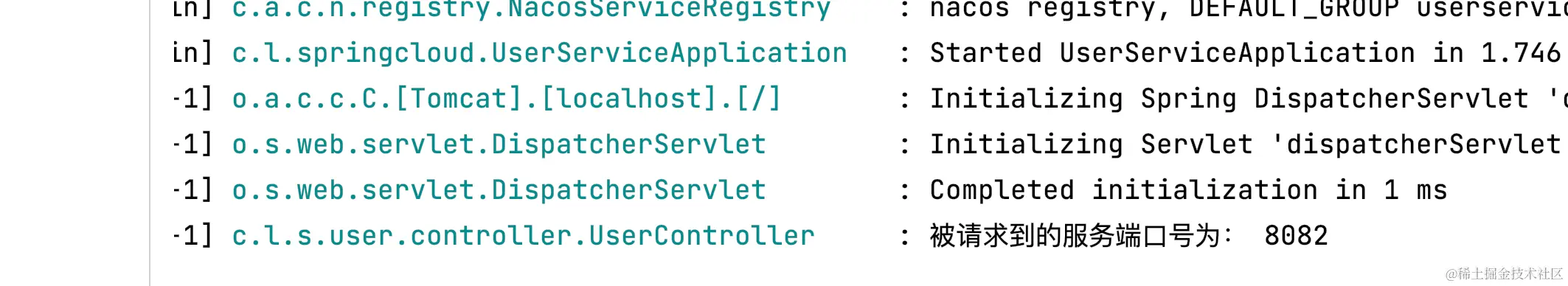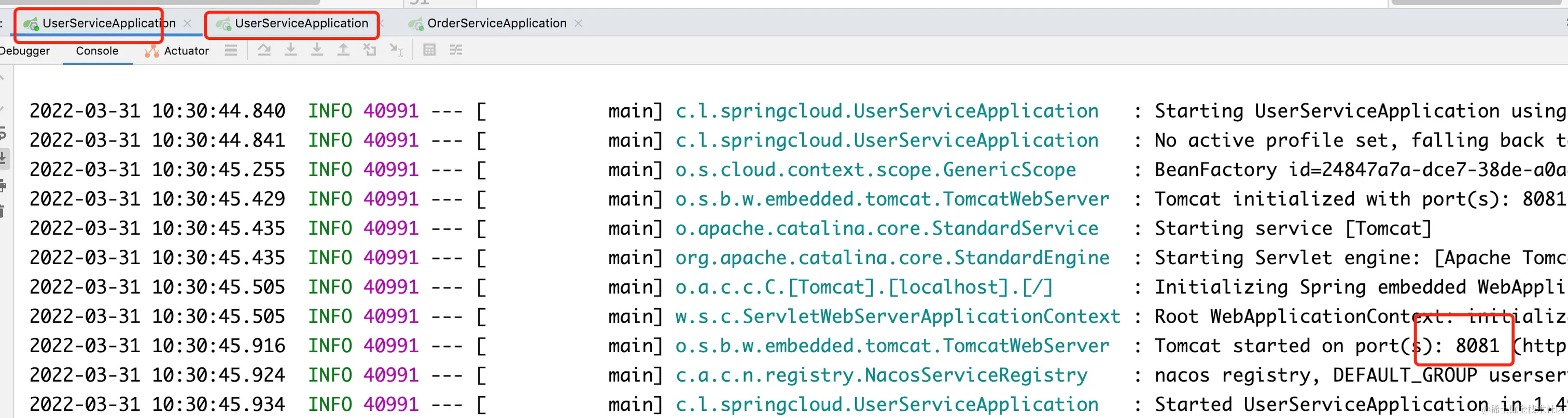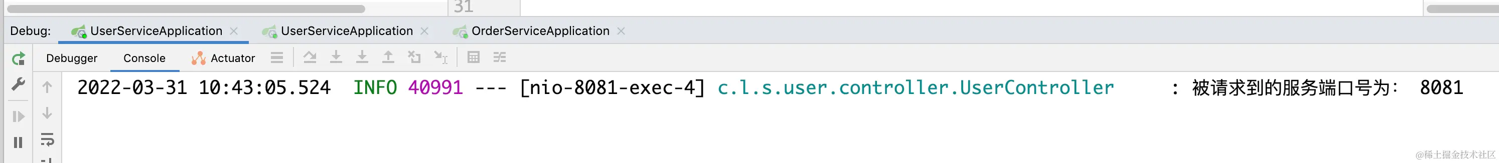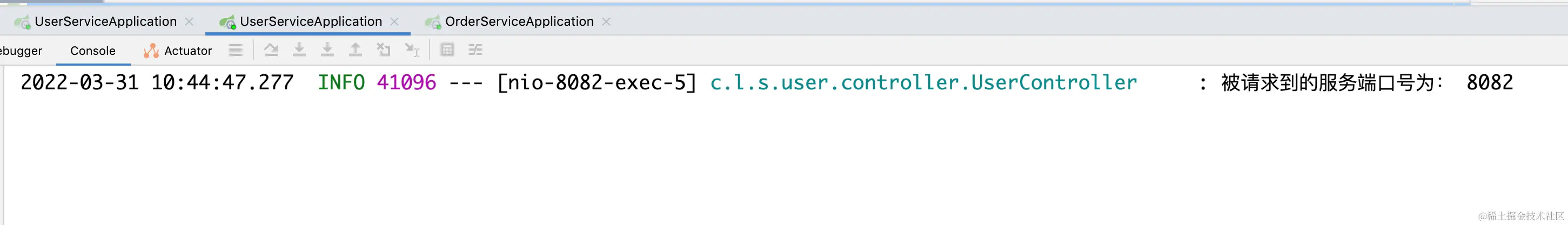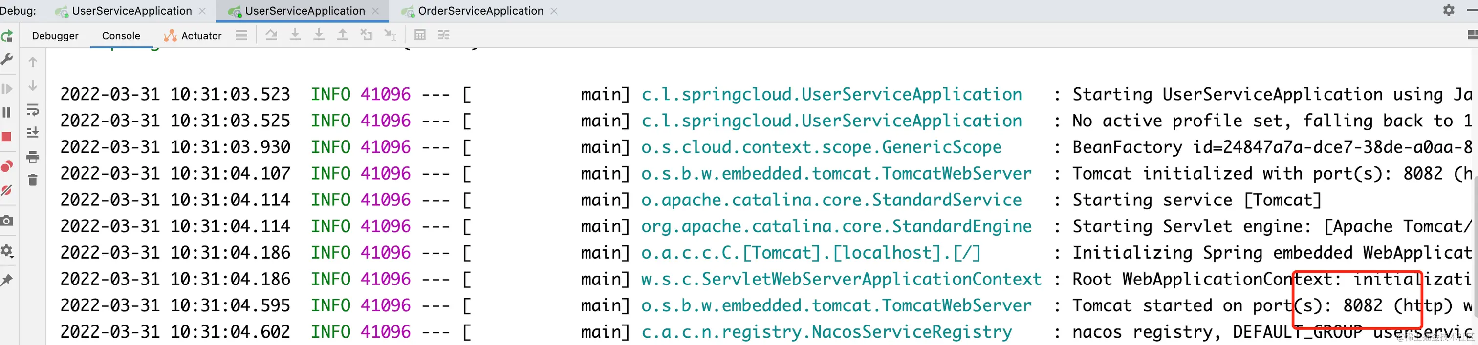 然后自启动订单服务,订单服务的接口中已经通过openFeign成功调用了userservice中的接口。我们观察日志,看看调用的是哪个服务。