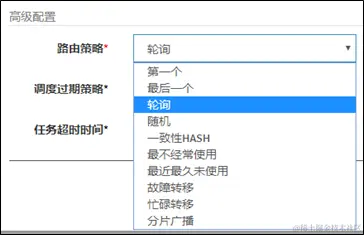 支持设置指定任务执行节点路由策略,包括轮询、随机、广播、故障转移、忙碌转移等;