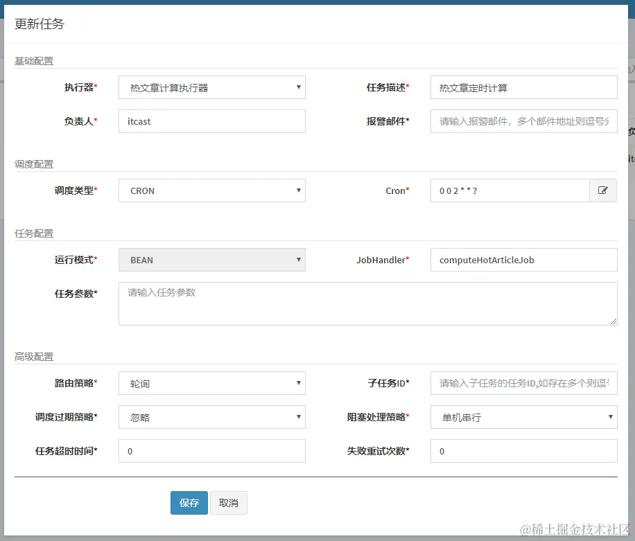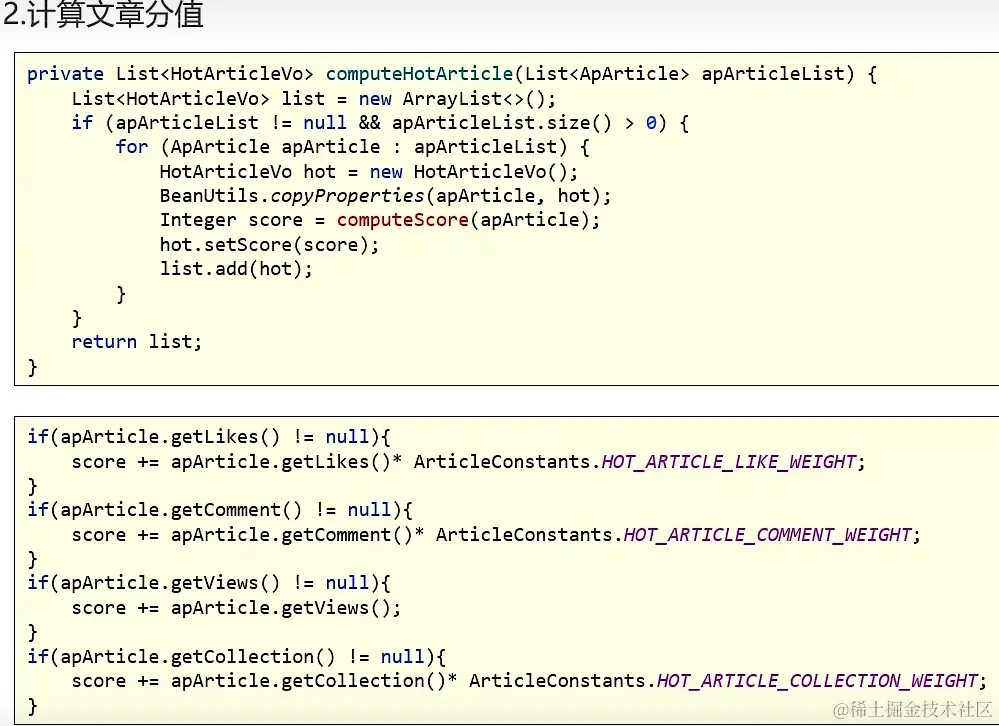 - 根据文章的行为(点赞、评论、阅读、收藏)计算文章的分值,利用定时任务每天完成一次计算