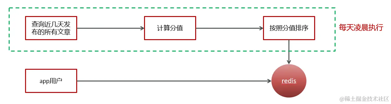- App端用户查询文章列表的时候,优先从redis中查询热度较高的文章数据