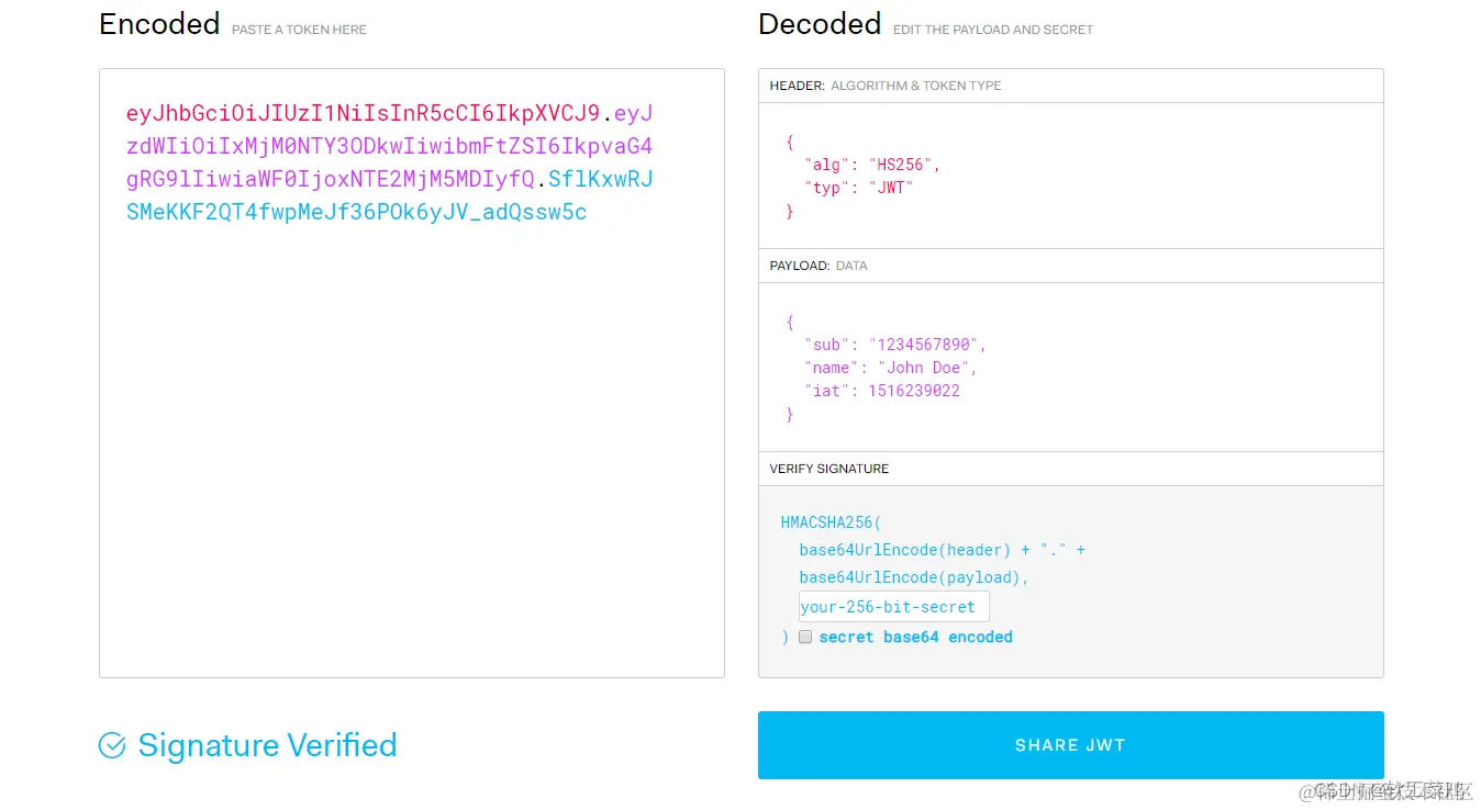 如前所述,JWT头和有效载荷序列化的算法都用到了Base64URL。该算法和常见Base64算法类似,稍有差别。