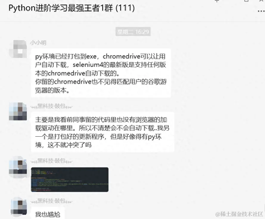 这里【小小明】给了一个指导,如下所示:py环境已经打包到exe,chromedrive可以让用户自动下载,selenium4的最新版是支持任何版本的chromedrive自动下载的。你留的chromedrive也不见得匹配用户的谷歌游览器的版本。