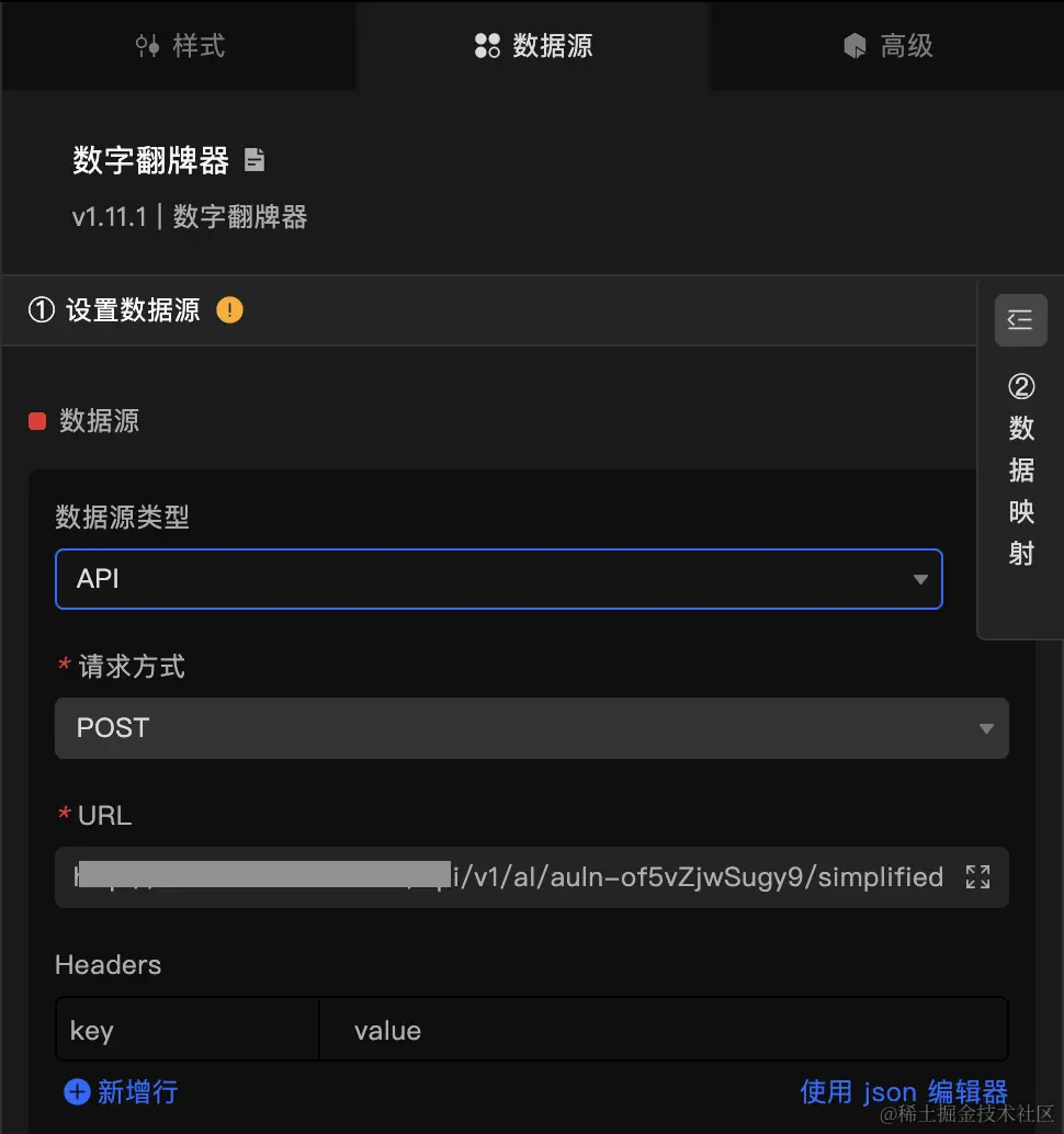 以这个数字翻牌器为例,双击数据显示区域,设置数据源选择类型为API,在URL地址中填入我们刚才生成的接口: