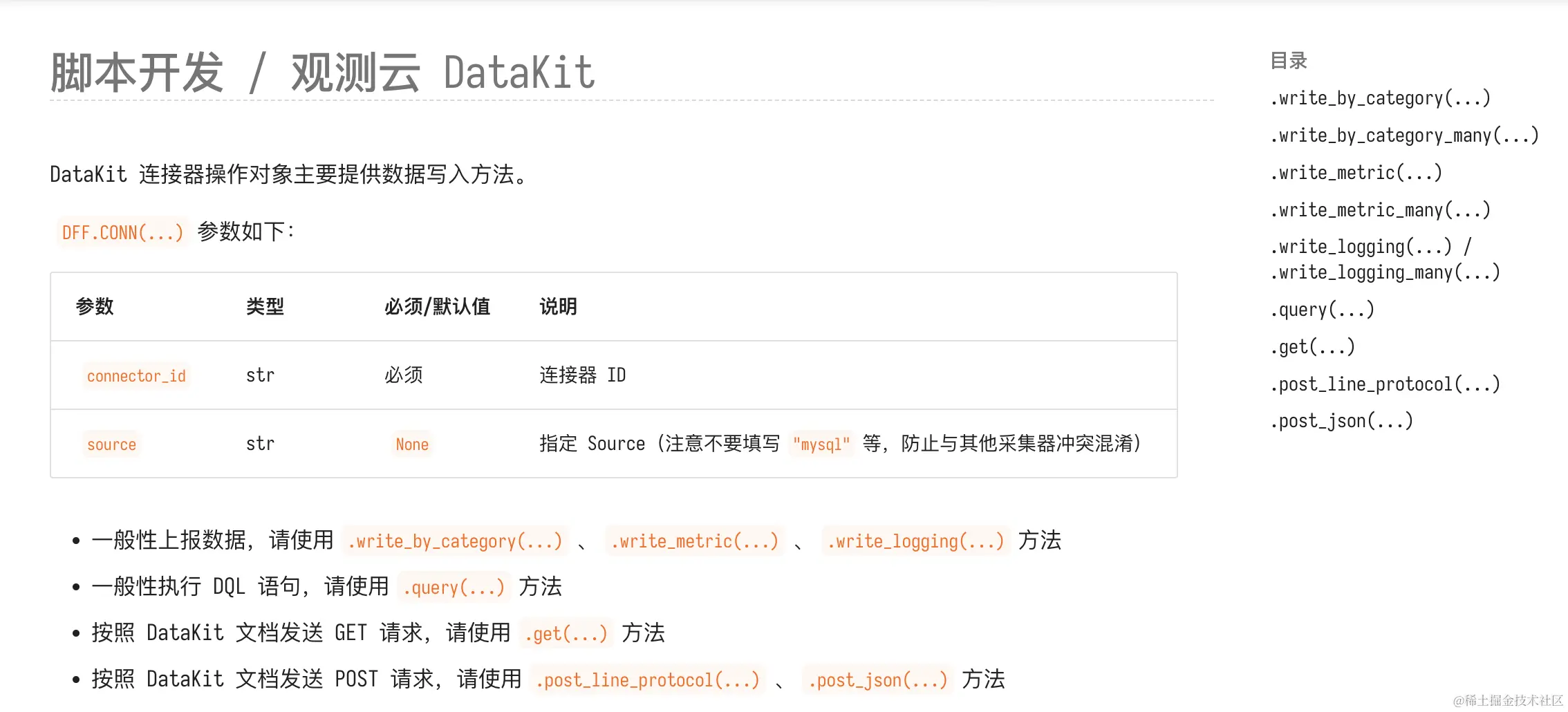 根据Function官网的介绍,通过开发平台访问观测云特定工作空间的数据主要有几种获取方式。一种是通过Datakit连接器连接到空间进行数据查询的方式。这种方式对于初次接触观测云的同学来说会比较友好。因为连接器对象自身封装了一些数据查询方法,大家可以按照官网的例子方便的实现数据查询功能。另一种是通过观测云网关连接器进行对应工作空间的访问,这种方式的学习成本相对较高,需要理解观测云OpenAPI的设计及请求构造方式。不过适用场景方面应该会更灵活一些。本文使用的是datakit连接器的query方法进行数据的获取: