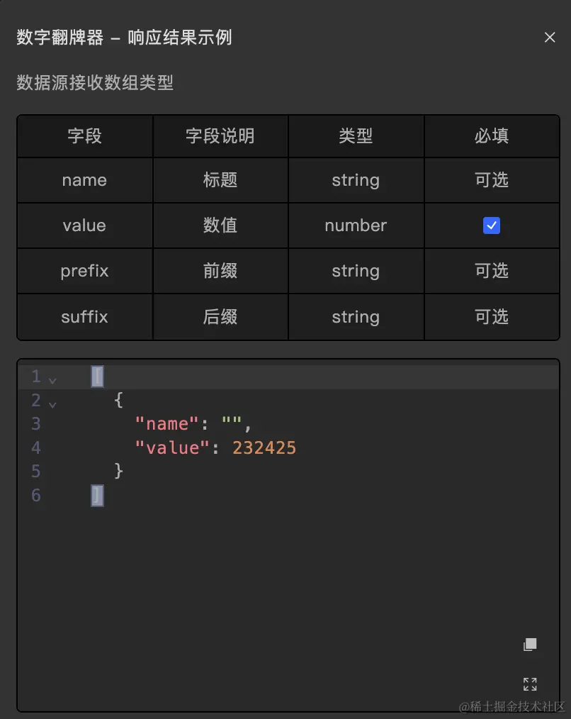 对于数字翻牌器来说,我们需要返回一个json数组,每个数组中的k-v取值和类型按照图中表格进行配置,就可以将数据正确发送给对应控件了。编写针对其他控件的Function API时,如果不知道如何确定返回值格式,就去看一下示例吧。