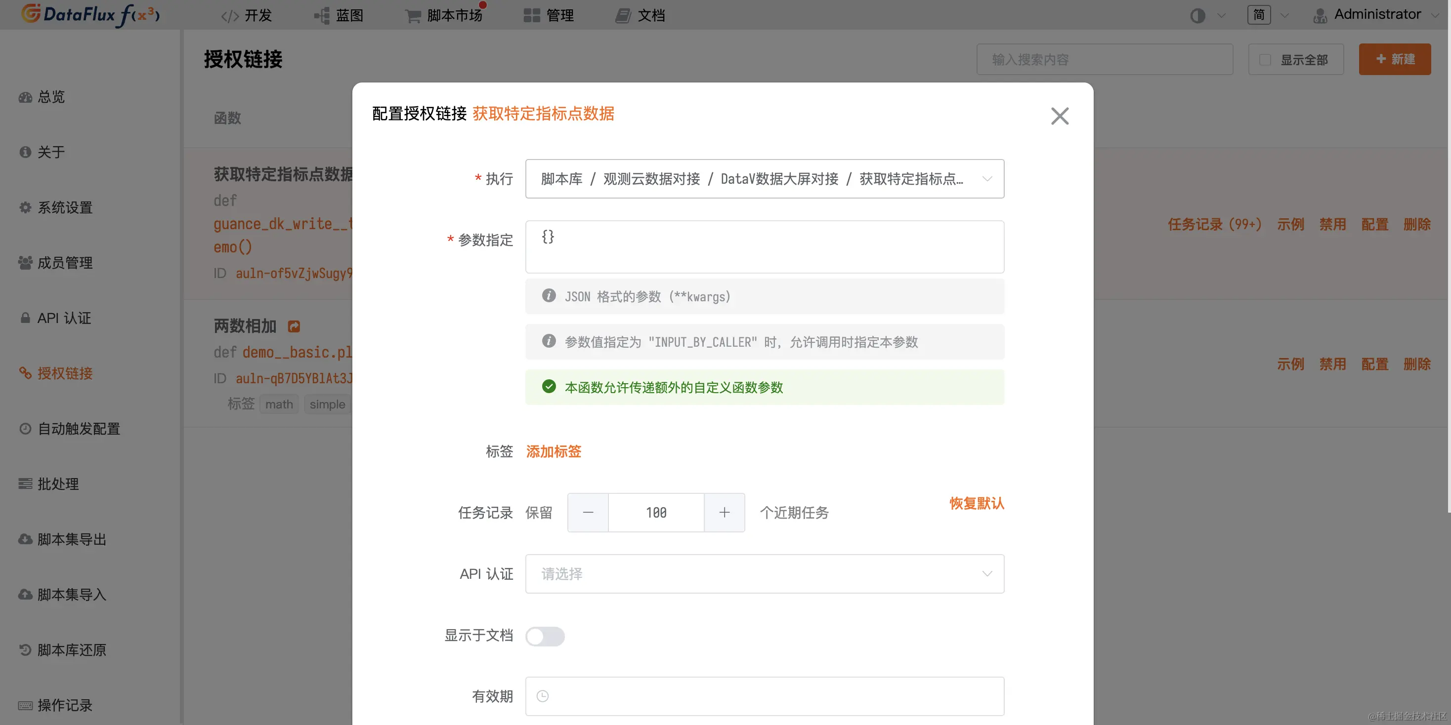 声明的作用是让Function平台能够获取需要对外暴露服务的地址。接下来需要在「管理」-「授权链接」页面中点击新建,执行函数选择上面声明的datav_interface_demo并保存。