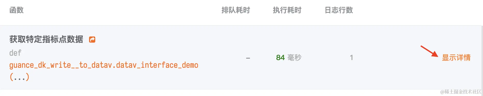 其实在上面示例代码中应该可以看到我们预留了接口调用时传入参数的处理。如果在实际使用时希望知道阿里云管控台配置的参数是以什么格式传入Function API的,可以在入口位置print(**kwargs),然后将代码发布给授权链接。在授权链接的任务记录中,点击最近一次调用的“显示详情”,详情信息就可以看到DataV组件下发的参数格式了: