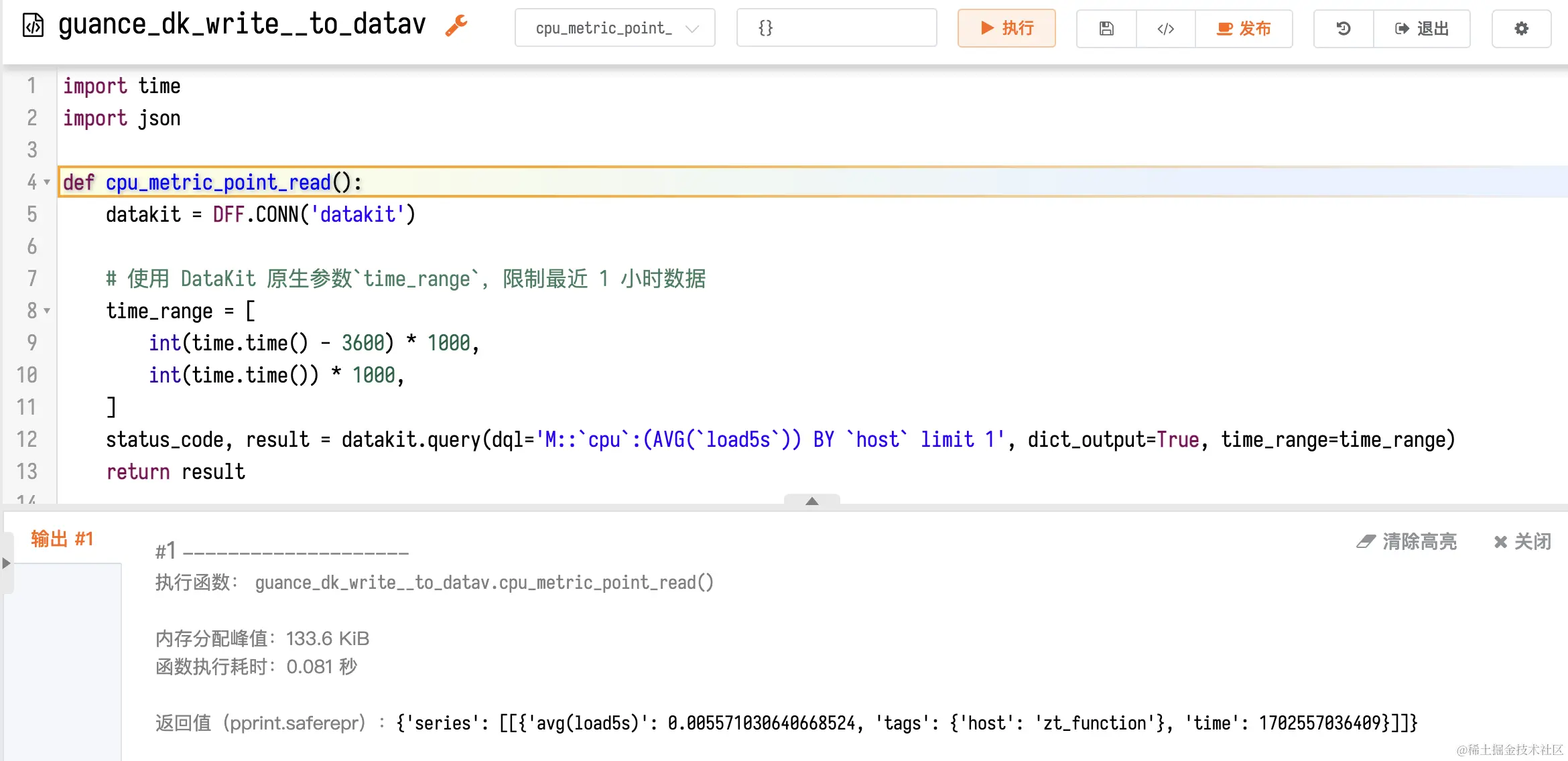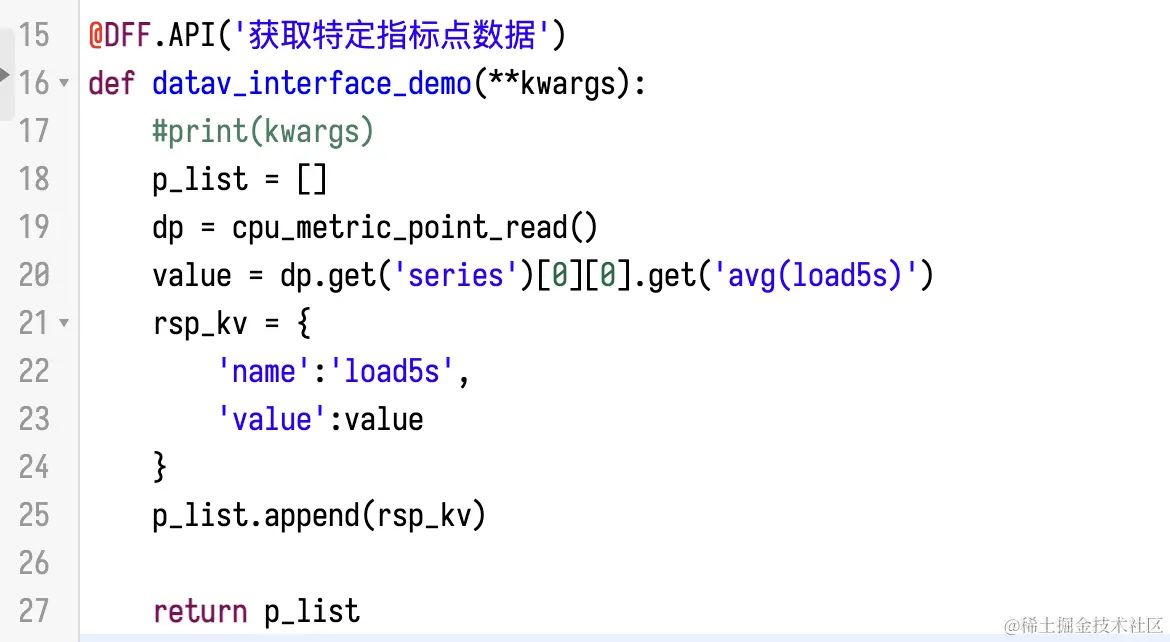 在暴露接口之前,还需要做两方面的准备。一个是我们接口对外提供的数据格式。这个信息需要根据大家所选用的可视化产品,按照产品要求的数据格式对外返回数据。另一个是接口对入参的处理,这个取决我们对接口功能的定义和设计。还是以上面CPU负载这个指标为例,假设考虑最简单的实现方式,调用方无需下发入参,仅以接口区分获取数据的类型。则对上述代码再次封装,处理好返回值格式后将这个接口函数通过装饰器声明给Function平台: