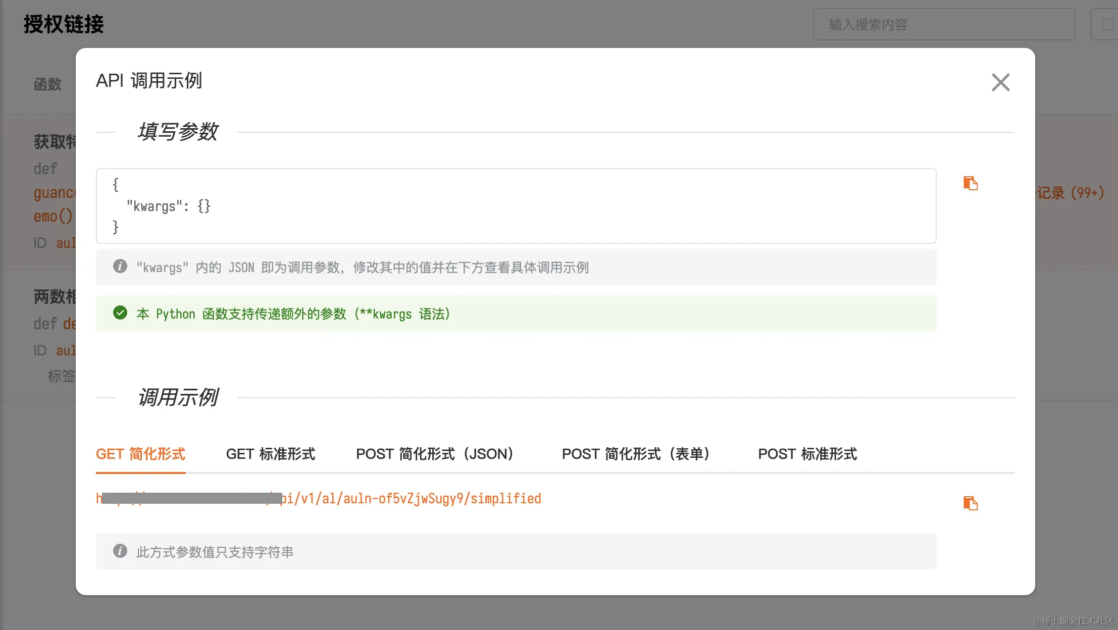 这个操作之后,一个可对外调用的授权链接就生成了。点击授权链接的示例,可以获取如何调用链接的提示: