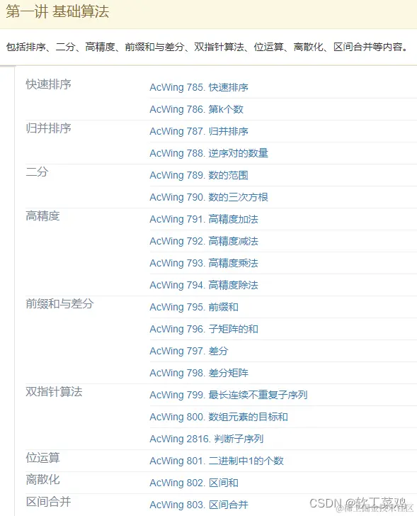 包括排序、二分、高精度、前缀和与差分、双指针算法、位运算、离散化、区间合并等内容。