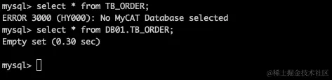 说明1:当checkSQLschema为true时,我们可以不进入数据库查询,即使用DB01.TB_ORDER的方式,但是如果checkSQLschema为false的时候,就不能这样写了,就必须要要先usr DB01;今日数据库里面在查找,所以这里大家就直接给true就行了。