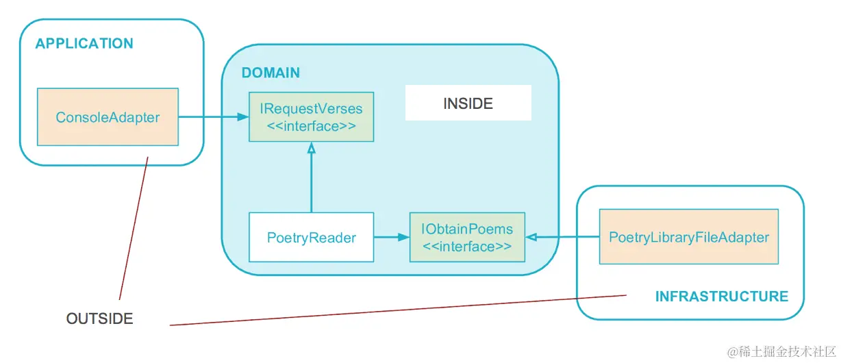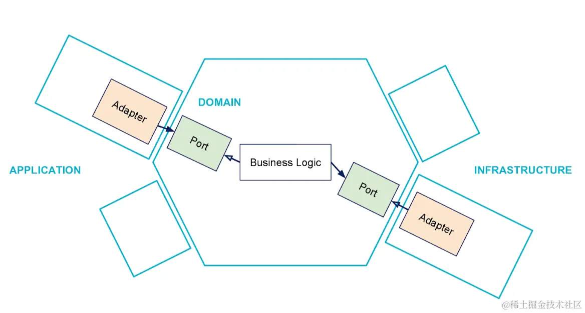 内部端口和适配器:将应用程序划分为核心业务逻辑(Application)和外部环境(Infrastructure)两部分,内部端口表示系统对外部环境提供的服务,而内部适配器则负责将内部数据结构适应外部环境的需求