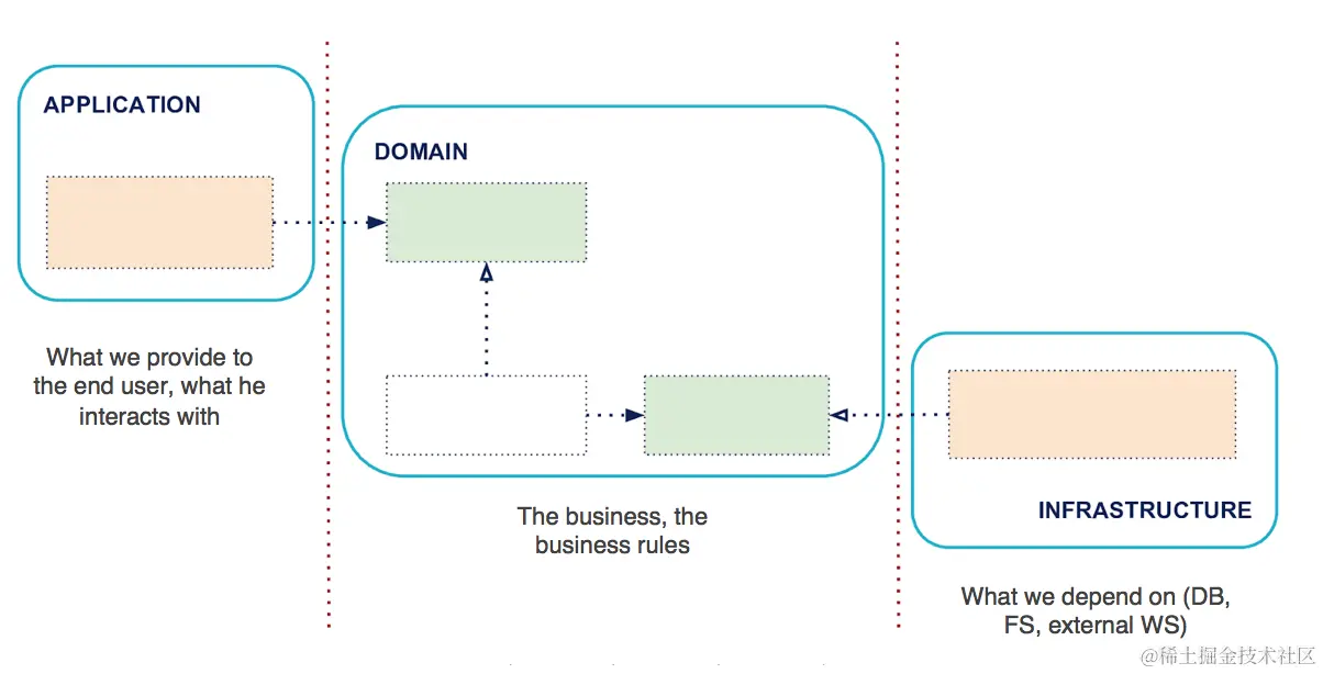 技术上,就是 Application 和 Infrastructure 都不能直接互相调用对方的功能或者操作,只有经过 Domain 的接口才能沟通,确保 Domain 部分具有完整的独立性,不受 Application 和 Infrastructure 变更的影响,从而保持稳定,这样的代码结构易读、易管理、易维护。