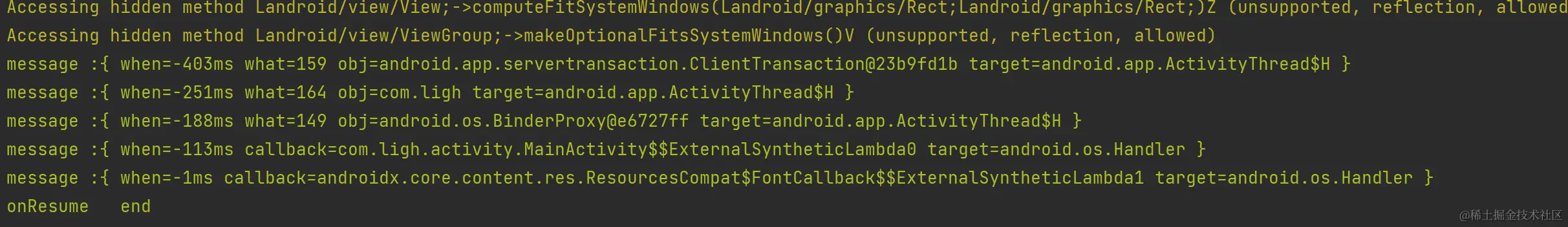 很明显,最后一个message就是我们post的message。两次打印中第一个meassage对象的哈希值相同,是同一个message,说明onCreat与onResume在同一个message中执行。
