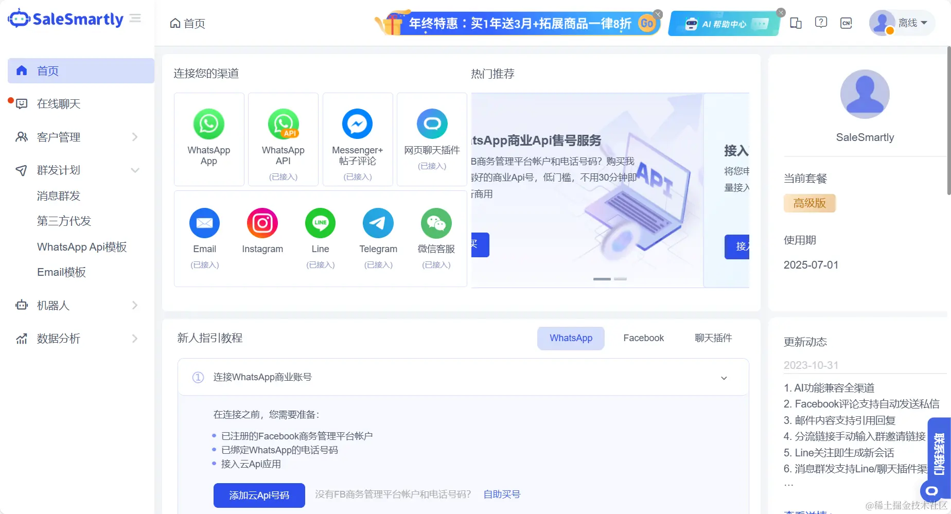加强版:10个坐席、无限信息,可以集成WhatsApp商业 API账号