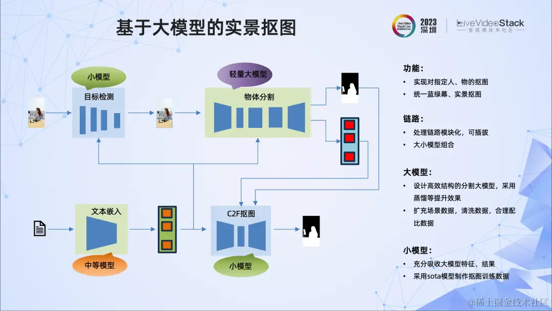 在这个框架中,模块是可插拔的,而且采用的是大小模型结合的方式。小模型会充分吸收大模型的信息,比如这里的抠图网络,它吸收来自分割模型的特征,提高了抠图的效果。