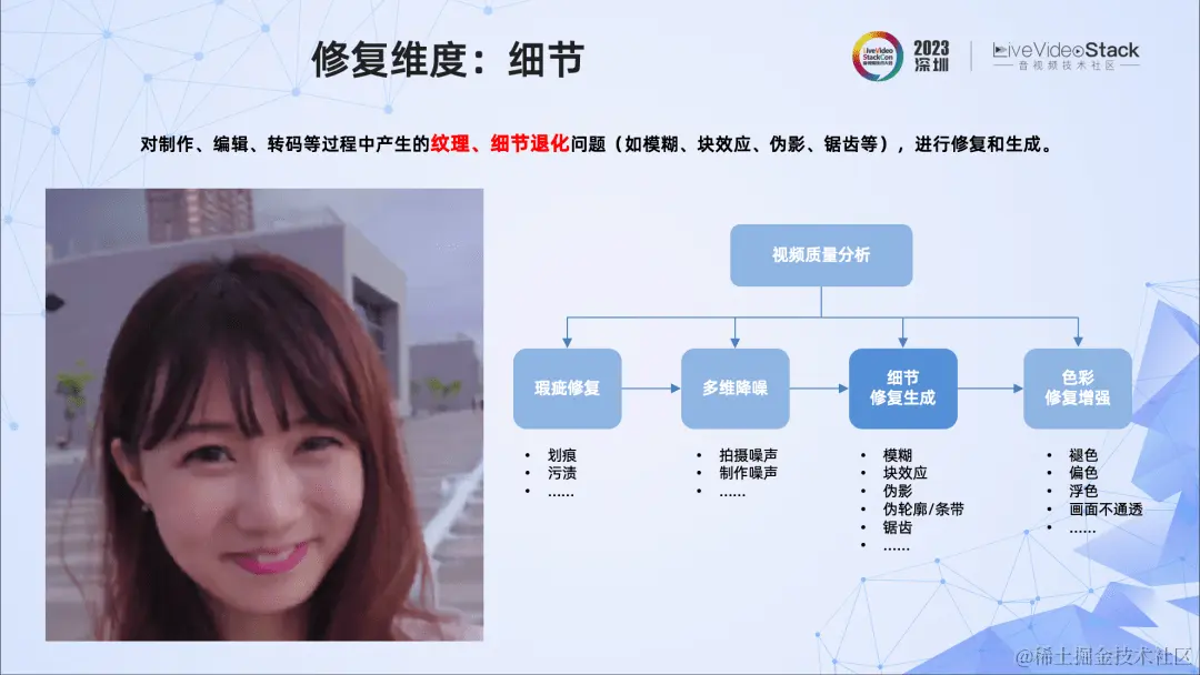 视频修复的维度非常多样,比如针对瑕疵、拍摄或制作中的噪声、细节、色彩等,都可以进行修复。这里讲的视频修复针对的是直播、点播等场景中,在制作、编辑、转码中引入的细节退化问题。如左图所示,我们能看到明显的细节退化,比如模糊、块效应、边缘锯齿等。
