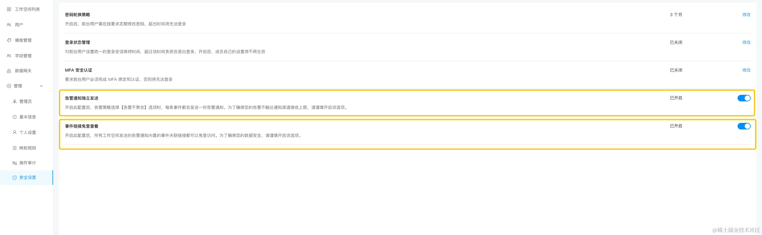 - 新增「事件链接免登查看」配置,即开启此配置后,所有工作空间发送的告警通知内置的事件关联链接都可以免登访问。若关闭该配置,则历史发送的免登链接都会失效,保障数据安全。