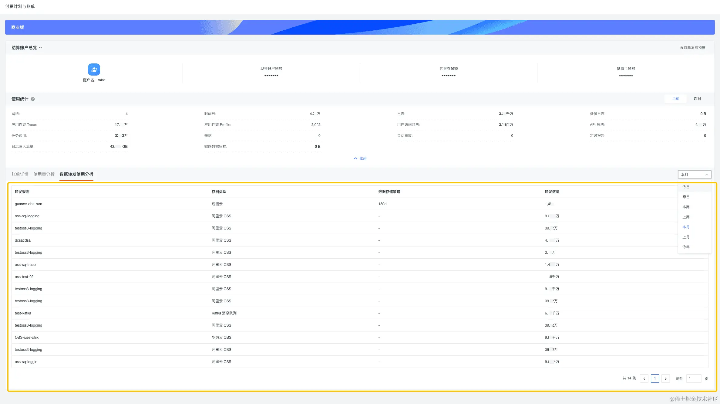新增「数据转发使用分析」列表,您可以直接查看当前工作空间所有数据转发规则的转发数量情况。若转发规则是到观测云备份日志的模块,则会显示对应的保存策略。同时,您还可以利用时间空间筛选所需的数据转发情况列表,方便您快速查看历史日志的备份整体情况。