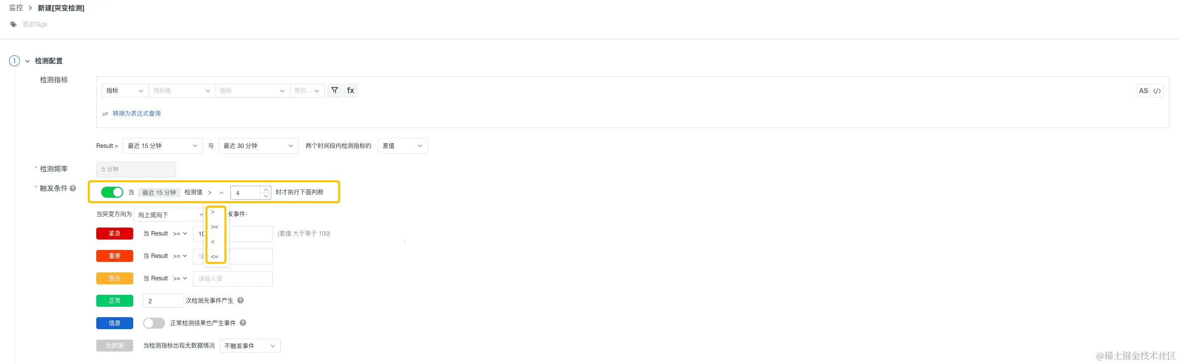 - 「突变检测」优化,新增触发规则的前提条件,即您需要先配置阈值,当检测值满足所设阈值时,才继续进行以下突变检测规则,优化了监控精准性度。