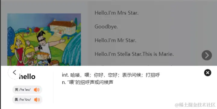 绘本句子的单词支持点击,并出现单词释义。