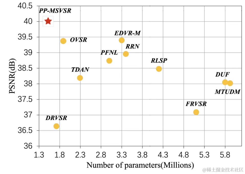 在当前参数量小于6M的轻量化视频超分模型在 UDM10 数据集上的PSNR指标对比上,PP-MSVSR可谓是“遥遥领先”: