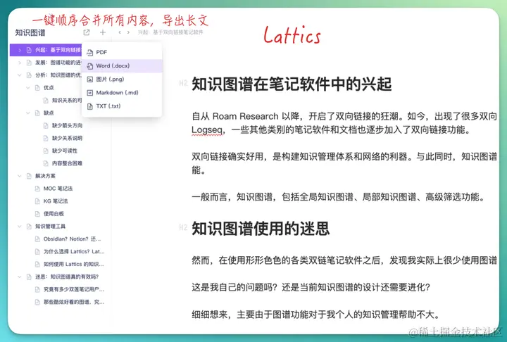 - 在图谱中相互关联的内容,无法将卡片/文章快速整成可供分享的长文。