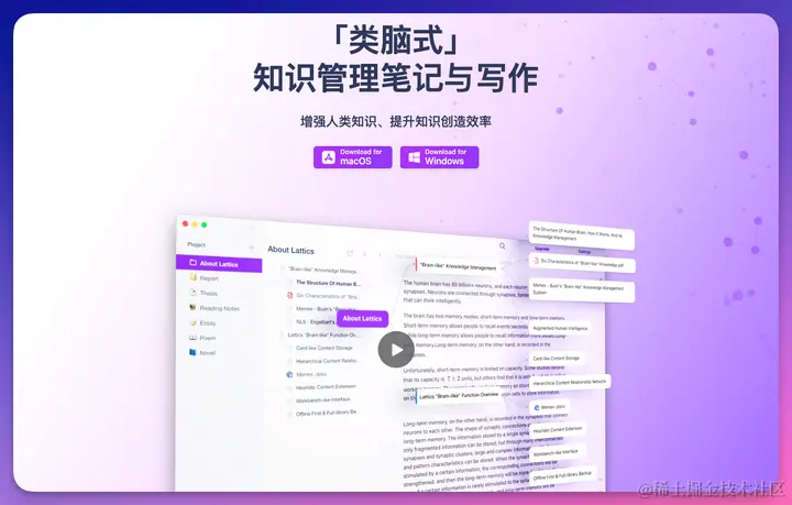Lattics 兼具了笔记软件和写作软件的诸多优点。Lattics 在自己的官网强调自己是以“类脑式”理念进行设计的。大家平时提到的“第二大脑” 更倾向于知识管理,强调使用软件高效存储和整理各种海量知识。
