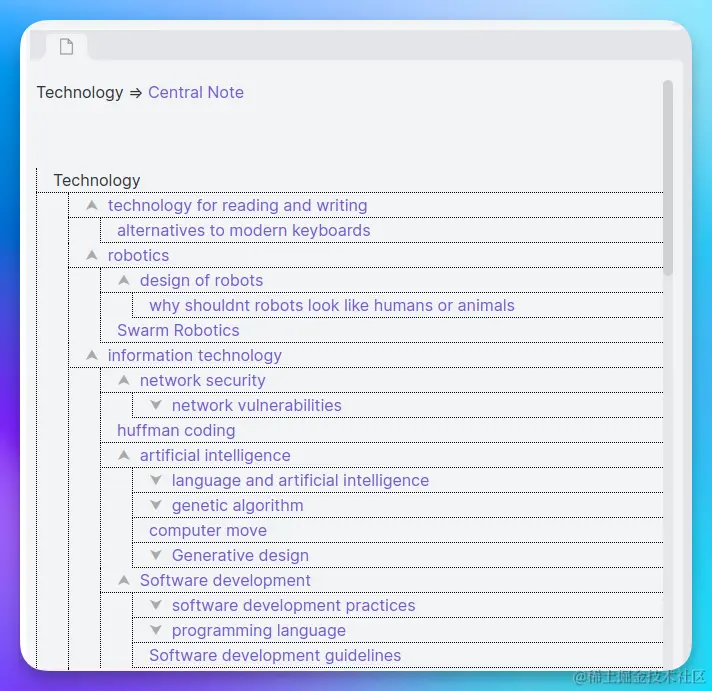 MOC 笔记法,即 Map of Contents. 一般翻译为「内容地图」,核心思想是在文字表达过程中善用双向链接,即通过文字将不同内容进行关联。用户可以文字的灵活性,轻松表达多种关系。