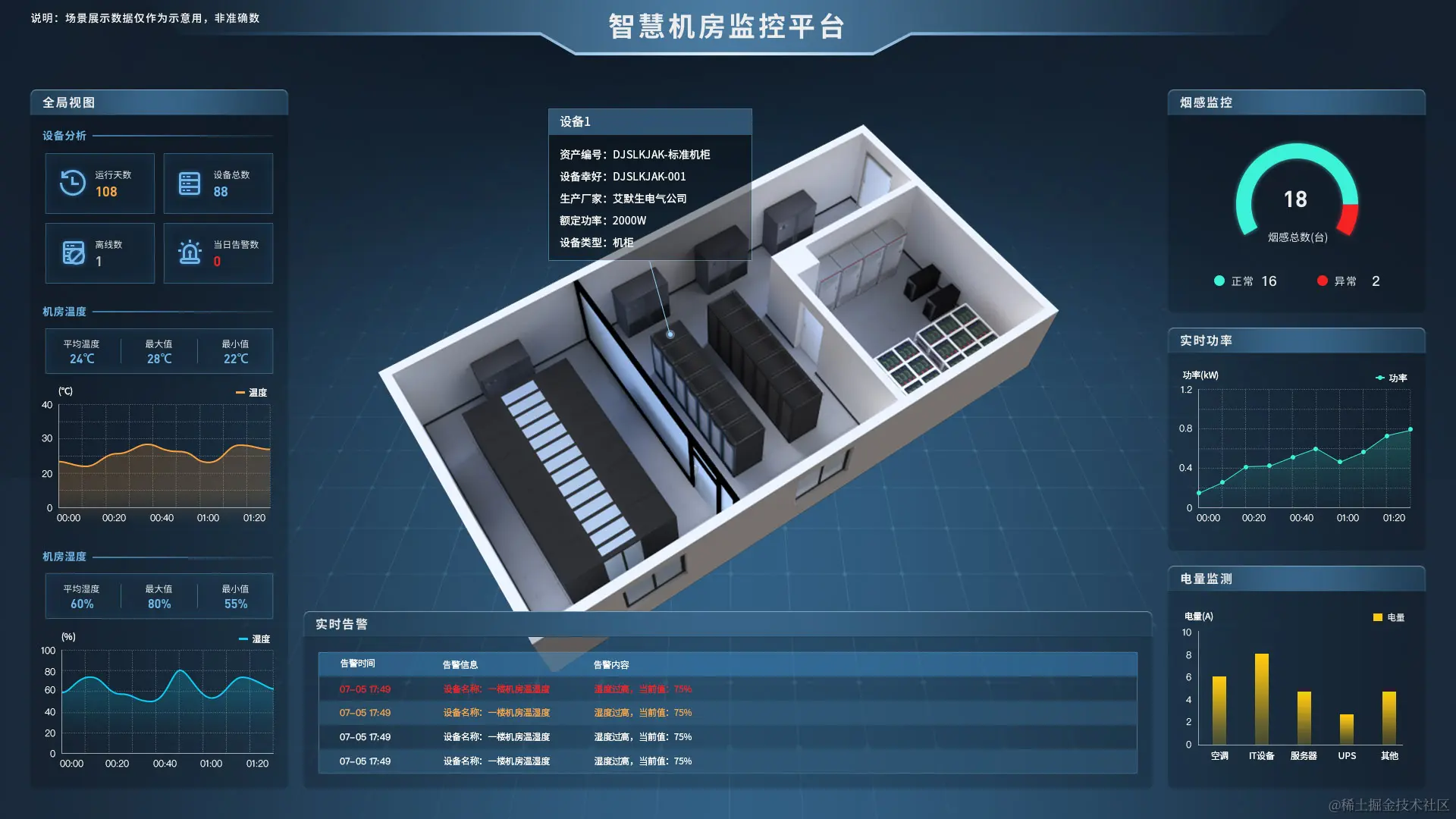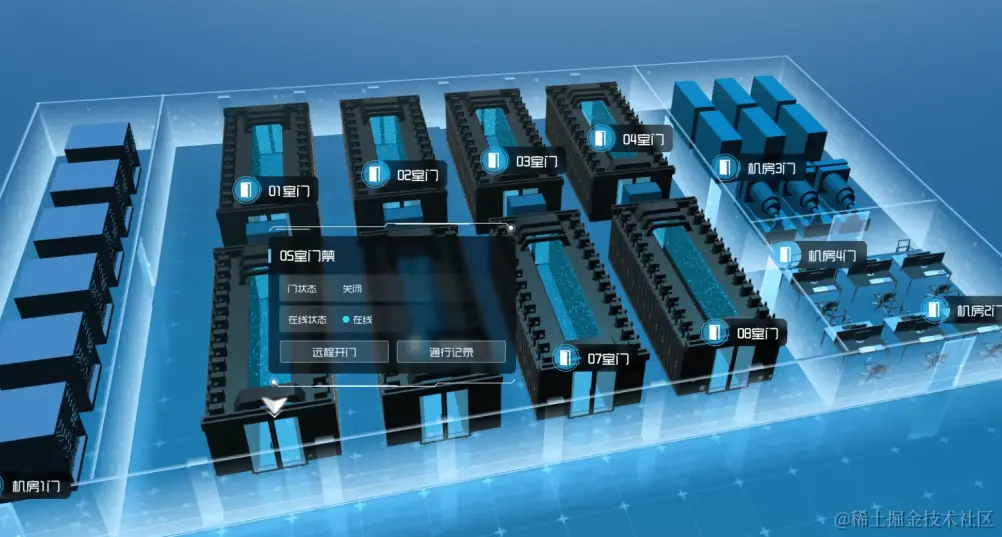 数维图(SovitJs)应用自主研发的 Sovit2D、Sovit3D 产品,无缝融合 2D、3D 技术,搭建了一套3D 可视化智慧机房可视化运维管理平台。通过数维图可视化开发平台实现可交互式的 Web 二三维场景,基于多维感知、场景物联、物信融合的技术理念,不断丰富与完善数据中心机房全面感知,实现设备设施智能巡检、环境风险监测预警,助力集控中心集中运维,辅助决策和全局掌控。