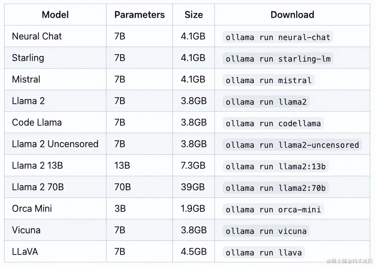 除了Llama2以外 Ollama 还支持其他的开原模型,如下图: