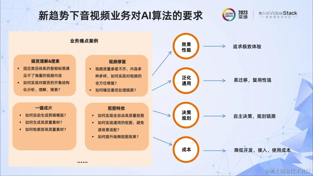 我们总结出几点新趋势下视频云业务对AI算法的要求,包括追求效果性能上的极致体验,追求算法的泛化性、通用性,提升AI自主决策、规划处理链路的能力,以及降低开发、接入、使用的成本。