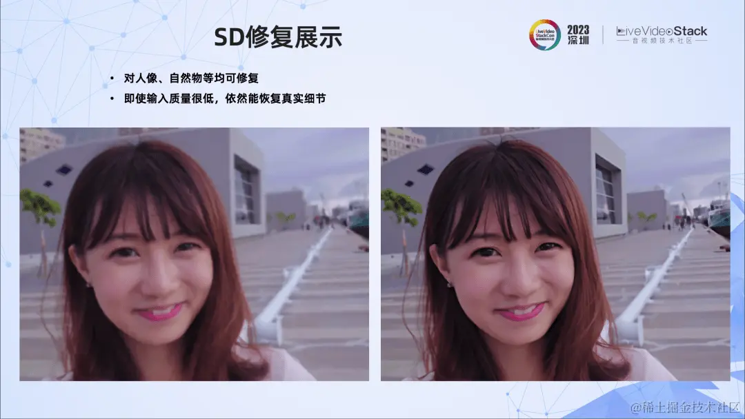 视频修复的维度非常多样,比如针对瑕疵、拍摄或制作中的噪声、细节、色彩等,都可以进行修复。这里讲的视频修复针对的是直播、点播等场景中,在制作、编辑、转码中引入的细节退化问题。如左图所示,我们能看到明显的细节退化,比如模糊、块效应、边缘锯齿等。