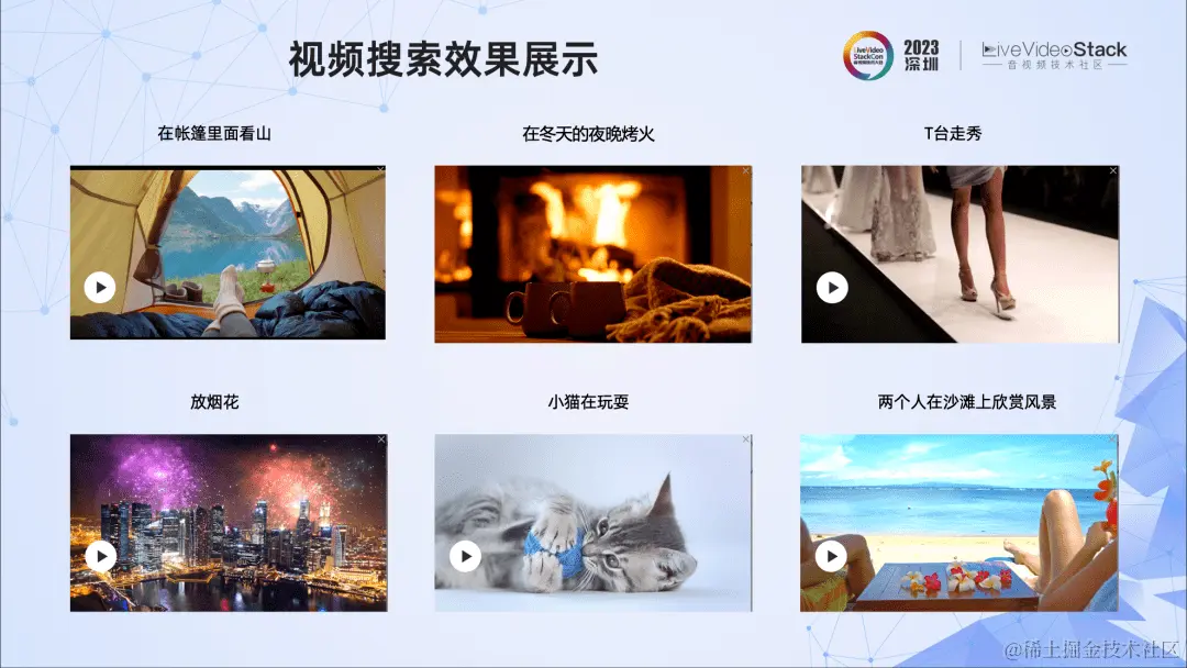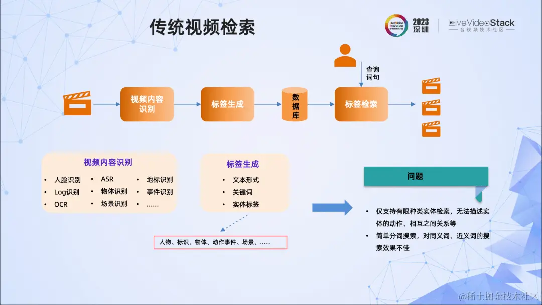 它通常采用小模型方法对视频内容进行识别,包括人脸识别、物体识别、Log识别、OCR、ASR等等,然后生成标签,这些标签是文本关键词形式的,且大部分是实体标签。这些标签都会送到数据库中。对于用户输入的查询语句,进行标签的查询,并返回对应视频的片段。