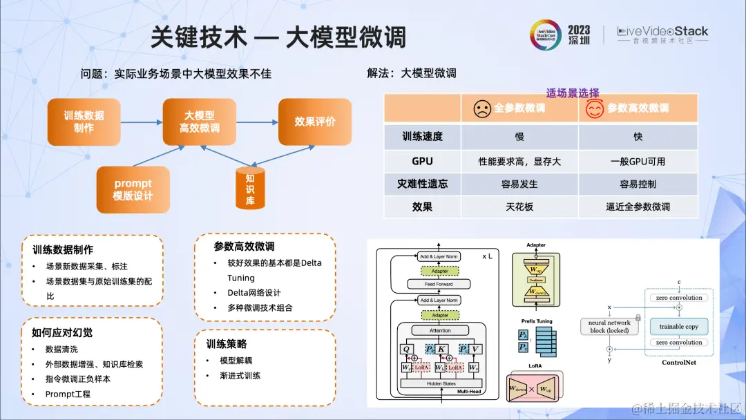 接下来的工作是调整它,解决其适配业务场景的问题,使它在业务场景下表现得比较完美。这里会进行微调,我们设计了Adapter结构,实践中采用了MLP和低秩分解组合的形式。另外,Adapter的插入位置也进行了很多尝试。还有一点是训练数据的制作,以及数据配比等等都非常重要。