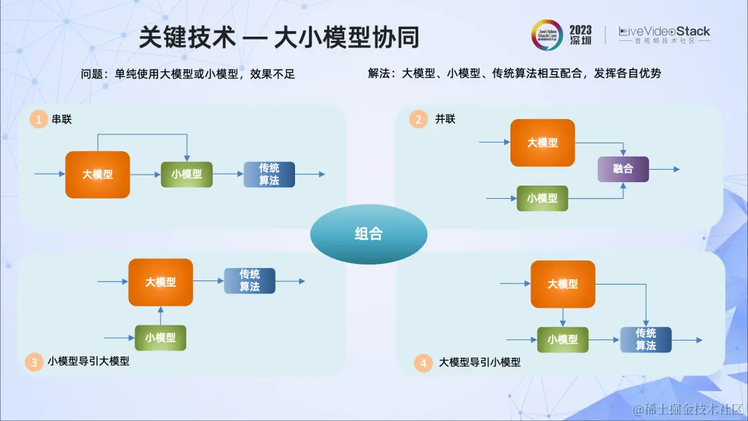 针对前面指出的大模型、小模型或传统算法各自存在的问题,我们提出几种大小模型、传统算法协同的方法,包括三者的串联、并联,用小模型特征引导大模型或者大模型引导小模型,以及它们的组合。目前,我们在实践中已经采用了大小模型协同的方法,比如实景抠图、声音克隆等算法,已经取得了比较好的效果。