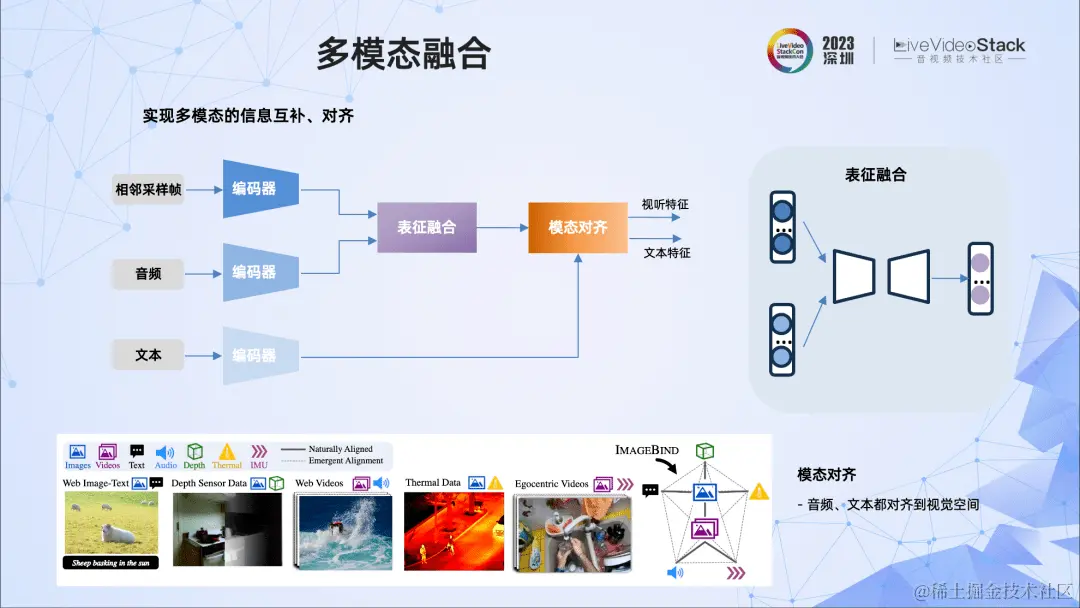 它实现了同一场景视觉与听觉的特征融合,也实现了视听特征与文本的模态对齐。我们借鉴了ImageBind的方法,把音频、文本都对齐到了视觉空间。