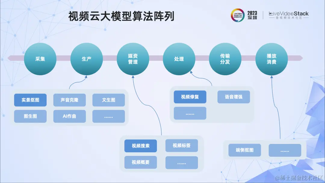 接下来介绍当前阿里云视频云在大模型方面的进展。在过去近一年的时间内,阿里云视频云在大模型方面做了深入探索,开发了多个算法,所做工作涉及音视频采集、生产、处理、媒资管理、传输分发、播放消费全链路的多个环节。