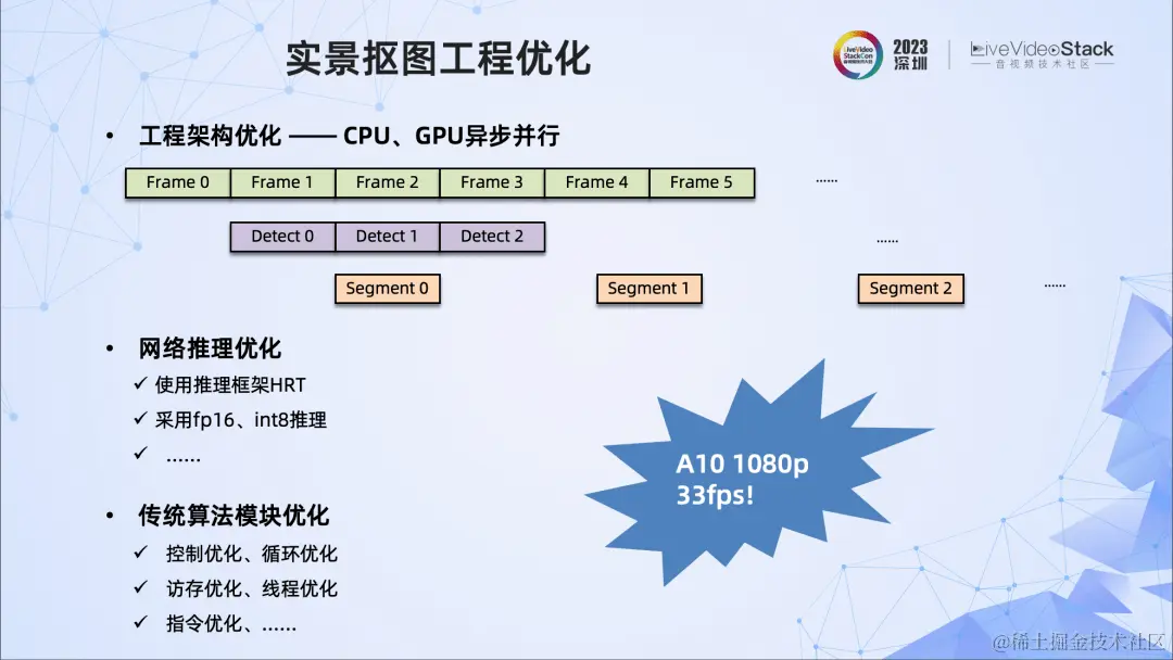 经过算法、工程两方面的优化,对于输入的1080p视频,我们在A10上实现了33fps的高质量抠图。