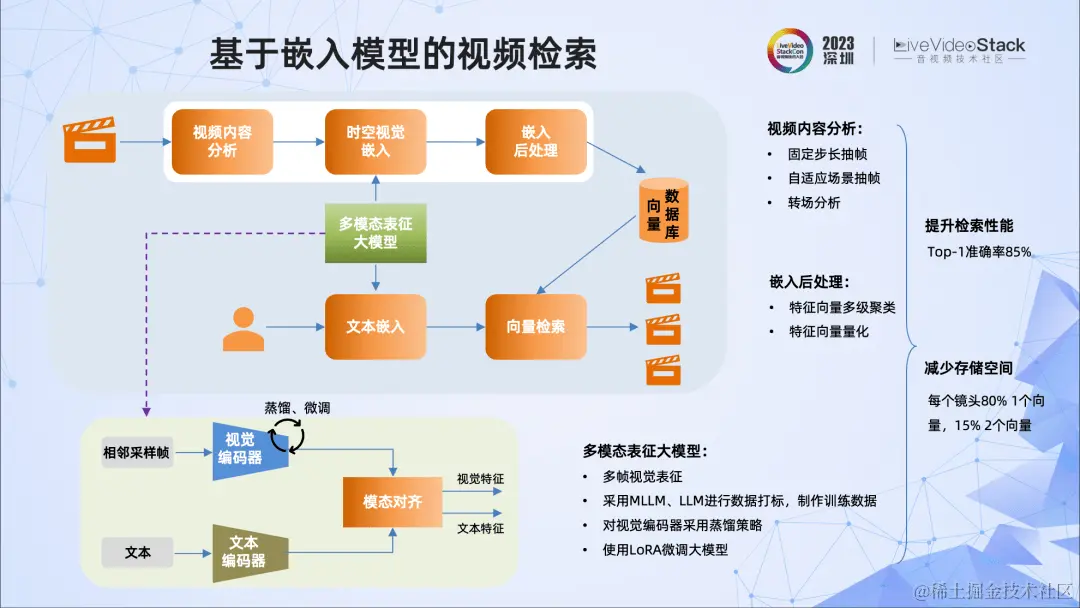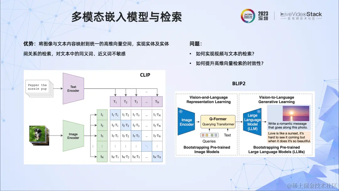 我们看到多模态表征技术将图像和文本映射到统一的高维空间中,实现了实体、实体关系等的高质量检索,并对文本中的同义词、近义词不敏感。这些典型的表征技术包括CLIP、BLIP技术等,还有针对中文的ChineseCLIP、TEAM等。但这些技术是针对单帧图像的,而我们的场景都是视频。那如何实现视频的检索?如何提升高维向量检索的时效性呢?