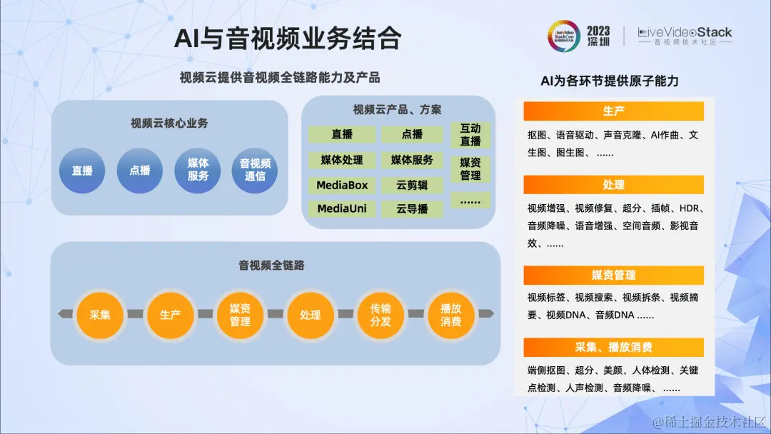 当然,AI除了提供算法原子能力之外,也渗透到视频云的引擎层、调度层、业务层,进一步提升它们的智能化水平。